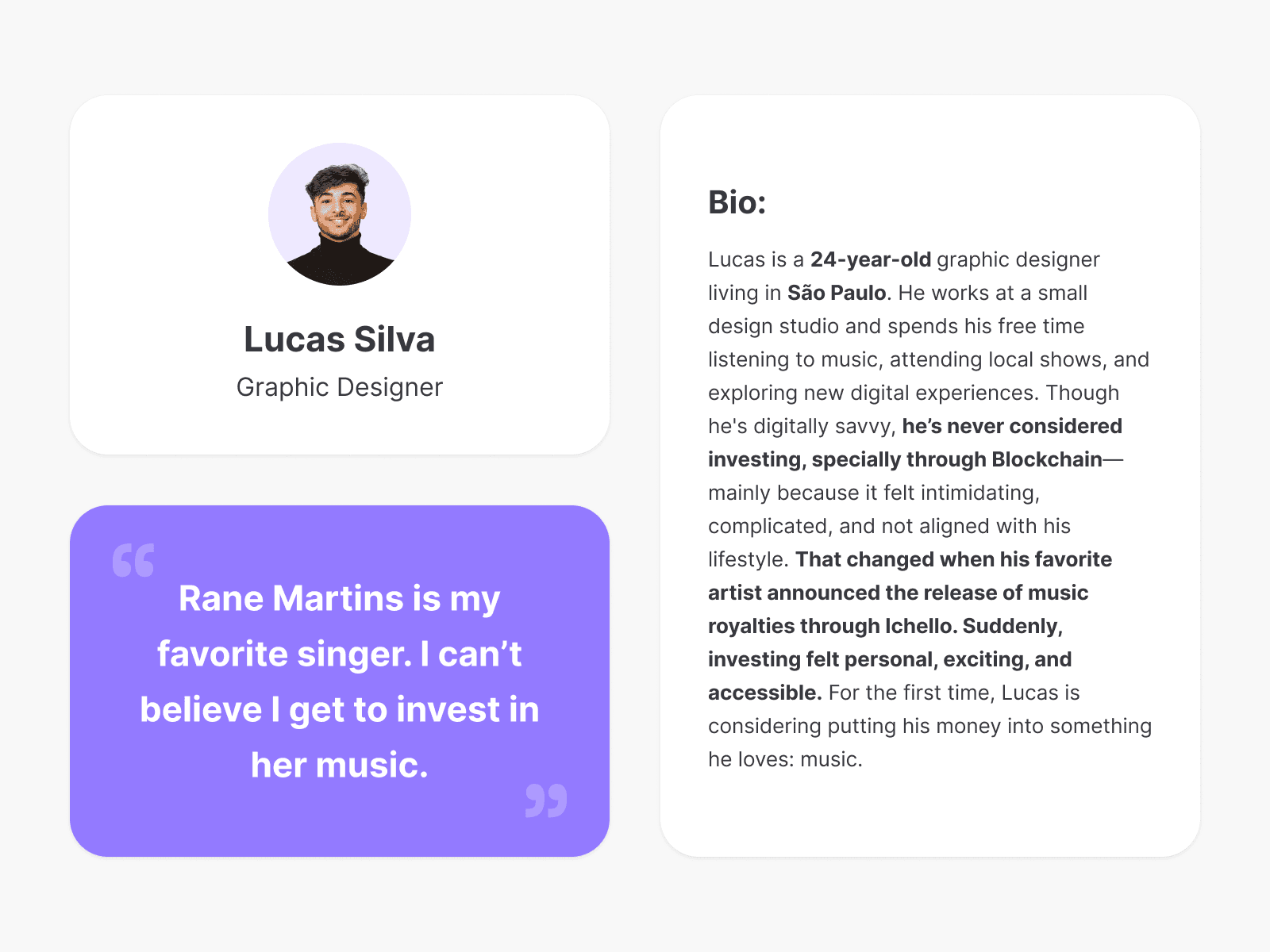 We created personas like Lucas Silva, a 24-year-old fan who had never invested before but loved his favorite artist and wanted to support them.